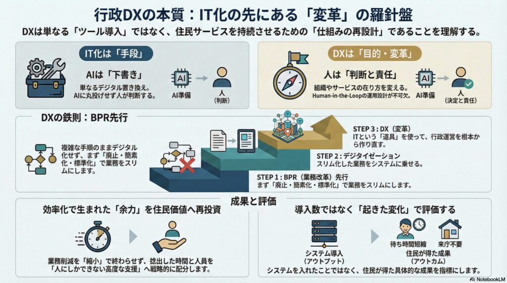 続いて、DXの目的について掘り下げました。効率化だけを目的にしてしまうと、無駄な業務を高速で回すだけになりかねません。重要なのは、効率化によって生まれた時間や人員、予算といった余力を、どこに再投資するのかをあらかじめ設計することです。住民サービスの質を高めるのか、職員の判断業務を高度化するのか、あるいは内部統制や監査体制を強化するのか。DXは、その再投資の意思決定まで含めて初めて意味を持ちます。