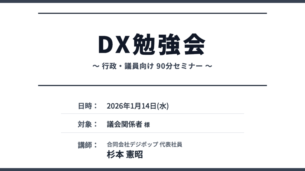 本勉強会は、特定のツールやベンダーを紹介する場ではなく、「行政・議会としてDXや生成AIをどう判断すべきか」を整理することを目的とした90分間のセミナーです。